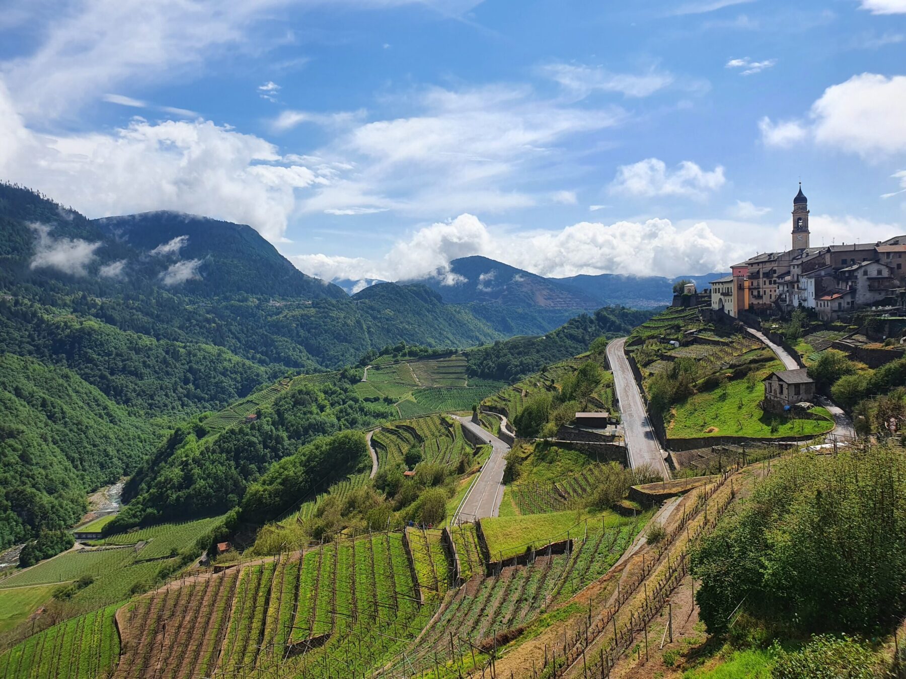 • I campi coltivati a vite su arditi terrazzamenti tra Faver e Segonzano