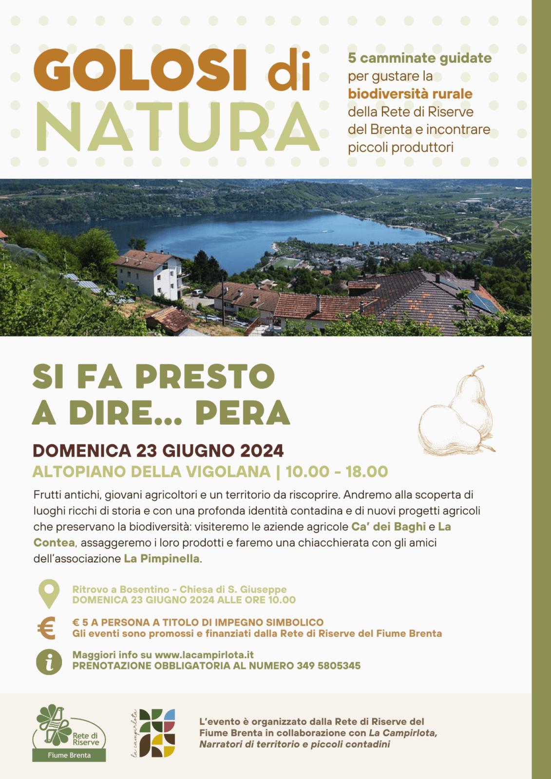 - Costo: € 5 a persona. Sono inclusi: accompagnamento professionale e interventi culturali, visite e degustazioni presso le aziende visitate, assicurazione, organizzazione. Si tratta di un piccolo impegno simbolico richiesto ai partecipanti, in quanto i costi di organizzazione e realizzazione degli eventi sono sostenuti dalla Rete di Riserve del Fiume Brenta, con l’obiettivo di favorire la conoscenza del territorio e delle sue realtà agricole in un’ottica di promozione della biodiversità rurale.